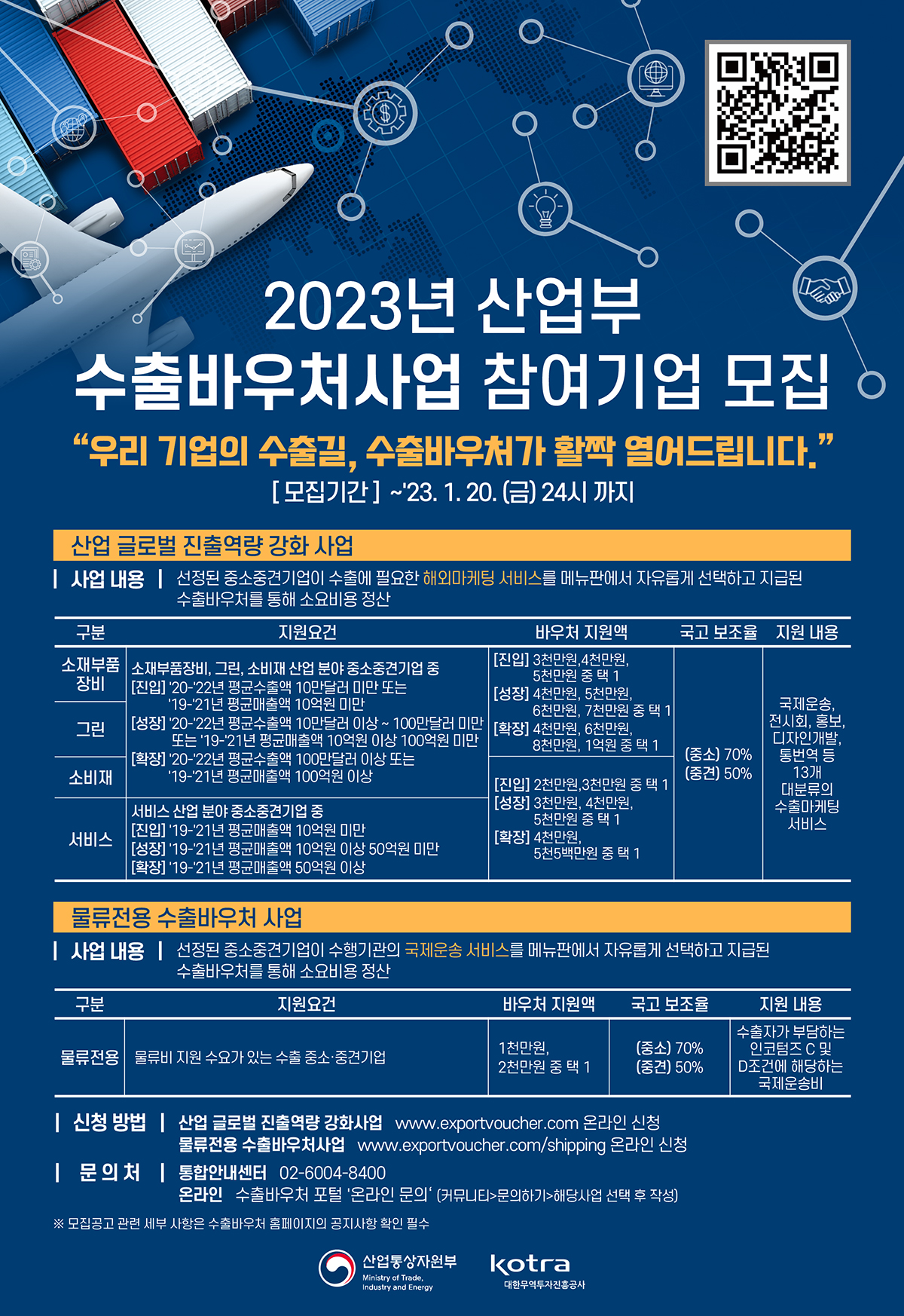 □ 사업명 : 2023년 산업부 수출지원기반활용사업(산업 글로벌 진출역량 강화 사업) ㅇ 사업내용 : 선정된 중소중견기업이 수출에 필요한 해외마케팅 서비스를 메뉴판에서 자유롭게 선택하고 지급된 수출바우처를 통해 소요비용 정산 □ 사업명 : 2023년 산업부 물류전용 수출바우처 사업 ㅇ 사업내용 : 선정된 중소중견기업이 수행기관의 국제운송 서비스를 메뉴판에서 자유롭게 선택하고 지급된 수출바우처를 통해 소요비용 정산 □ 모집기간 : ~'23 .1 .20(금) 24시까지 □ 사업신청 바로가기 링크 : (산업 글로벌) https://bit.ly/3Ce7Cbd (물류 전용) https://bit.ly/3CnR0On * 붙임2 포스터(PDF) 파일을 통해 신청하기 버튼 클릭 시 신청페이지로 이동합니다. * 문의처 (1) 통합안내센터: 02-6004-8400 (2) 온라인: 수출바우처포털'온라인 문의'(커뮤니티>문의하기>해당사업 선택 후 작성)