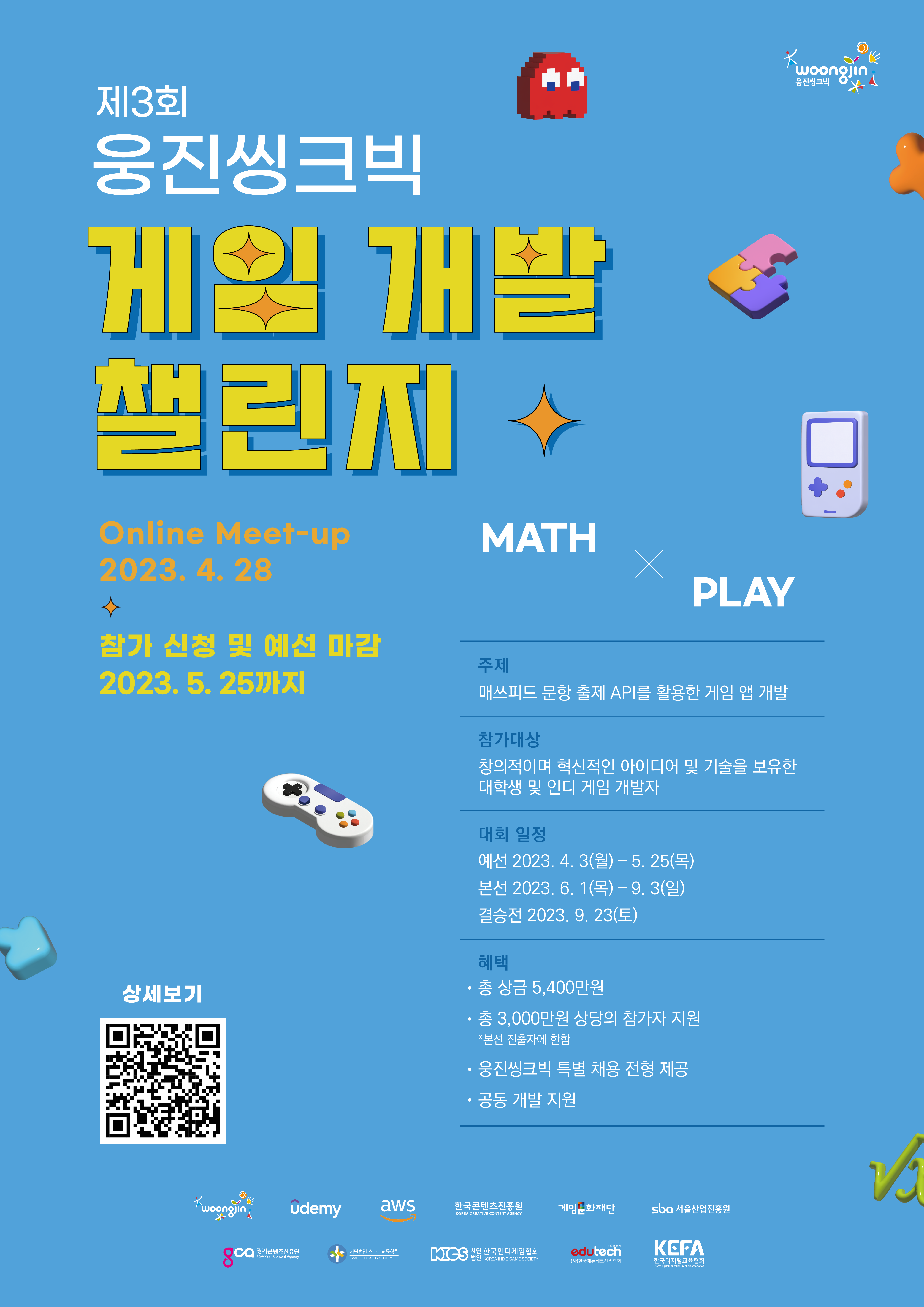 ■ 기간 및 일정 - 예선 응모 일정 : 4월 3일(월) – 5월 25일(목) 23:59까지 - 본선 진출팀 발표 : 5월 31일(수) 17:00 * 본선 및 결승의 상세 일정은 홈페이지를 통해 확인하실 수 있습니다. ■ 참가대상 - 창의적이며 혁신적인 아이디어 및 기술을 보유한 대학생 및 인디 게임 개발자 - 개인 혹은 6인 이하의 팀 단위 시상내역 - 상금 총 5,400만원 → 웅진씽크빅상(1팀) : 3,000만원 → ㈜웅진상(1팀) : 1,000만원 → 우수상(3팀) : 300만원 → 장려상(5팀) : 100만원 ■ 참가 혜택 - 본선 진출 30팀 → AI연산 학습 콘텐츠 매쓰피드 문항 API 제공 → LaTex 수식처리 Unity Asset 제공($60 상당) → AWS 크레딧 및 이용 관련 가이드 제공 → Udemy 강의 콘텐츠 제공 - 최종 수상 10팀 → 웅진씽크빅 채용 우대 혜택 * 자세한 지원 조건은 웅진 운영사무국 메일로 문의 → 공동 개발 및 투자 지원 *개발 환경 평가 후 제공 ※ 웅진씽크빅 채용 우대 또는 공동 개발 및 투자 지원 중 택 1 ■ 참가 방법 - 홈페이지를 통한 참가 신청 후 개별 메일로 절차를 안내해드립니다. (홈페이지 방문하기) → Step 1. 위 참가 신청 링크를 통해 웹사이트에서 참가 신청하기 → Step 2. 참가 신청 후 발송되는 안내 메일 링크를 통해 아래 서류와 파일을 제출 게임 기획서 및 팀 소개 자료 (필수 사항) ■ 심사 기준 - 게임 기획서를 기준으로 아래 네 가지 기준으로 평가합니다. → 재미(30%) I 독창성(30%) I 구현 가능성(20%) I 학습 효과(20%) * 단, 제출 기획서의 세부 내용 확인 필요 시 대표자나 신청자에게 전화나 메일로 문의드릴 수 있습니다. ■ 문의처 - 운영 사무국 : wjtb.challenge@gmail.com